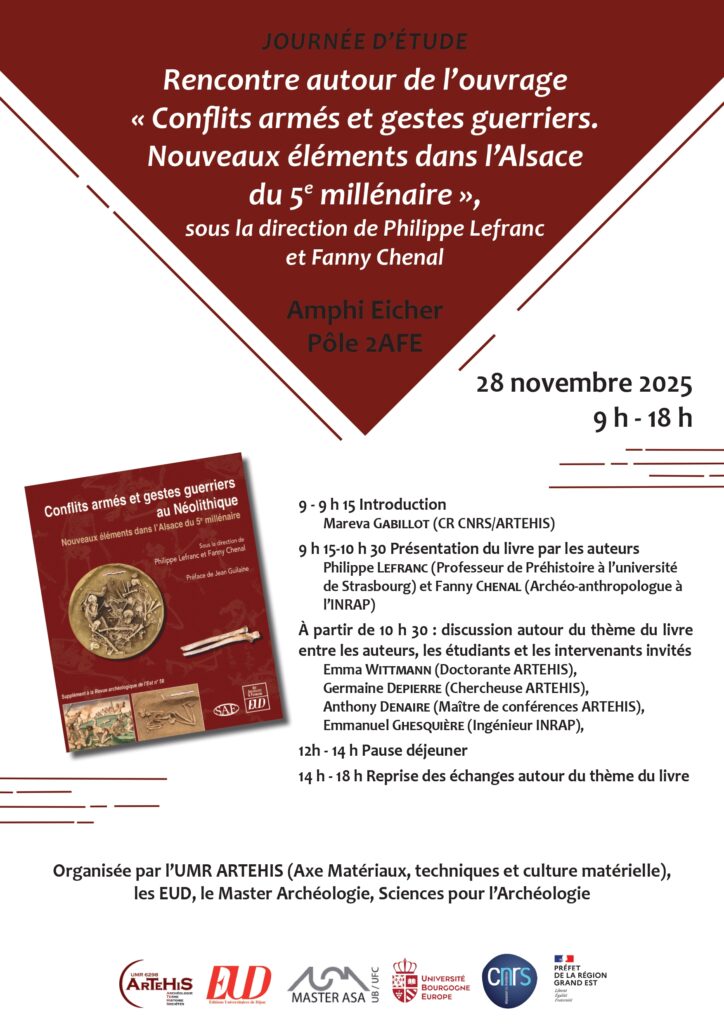 L’UMR ARTEHIS (Axe de recherche Matériaux, techniques et culture matérielle) participe, avec les EUD et le Master Archéologie, Sciences pour l’Archéologie, à l’organisation de la journée d’étude autour de l’ouvrage Conflits armés et gestes guerriers. Nouveaux éléments dans l’Alsace du 5e millénaire de Philippe Lefranc et Fanny Chenal (dir.).